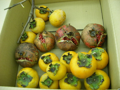 秋の果物♪ 柿&ザクロ!  無造作にダンボールに入れて、「いらなんだら捨ててくれ!」