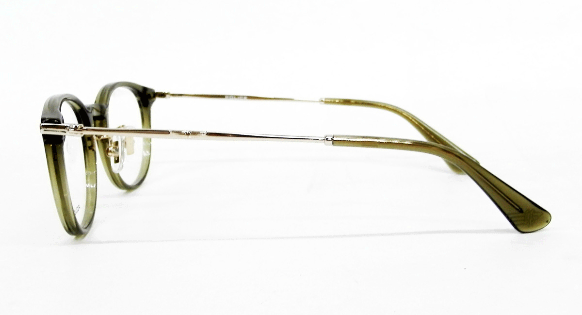 優しい印象のボストンシェイプのフレーム。クリアカーキとゴールドのコンビネーションフレーム。テンプルはステンレス製で強度が高く軽量です。
