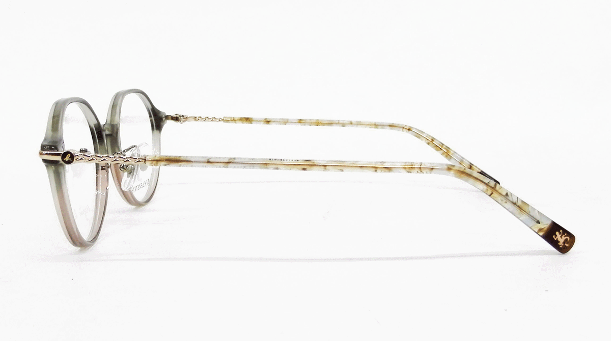 ナチュラルなラインでさりげなくクラウンパントになっているオシャレなフロントシェイプ。編みデザインのテンプルとの組み合わせもエレガントなフレーム。ゴールドのシャイニーカラーをベースに、深い・アンニュイ・パステルなどのカラーをツートーンとして織り交ぜたフレームに、それを引き立たせるパターンアセテートを使用。 シンプルなデザインをより際立たせるカラーリング。Agnes b.のアイコンであるリザードモチーフを、モダンエンドに。さりげなく光るメタルアイコンが印象的先端にはモダンと異なるアセテートを張り合わせてアクセントに。
