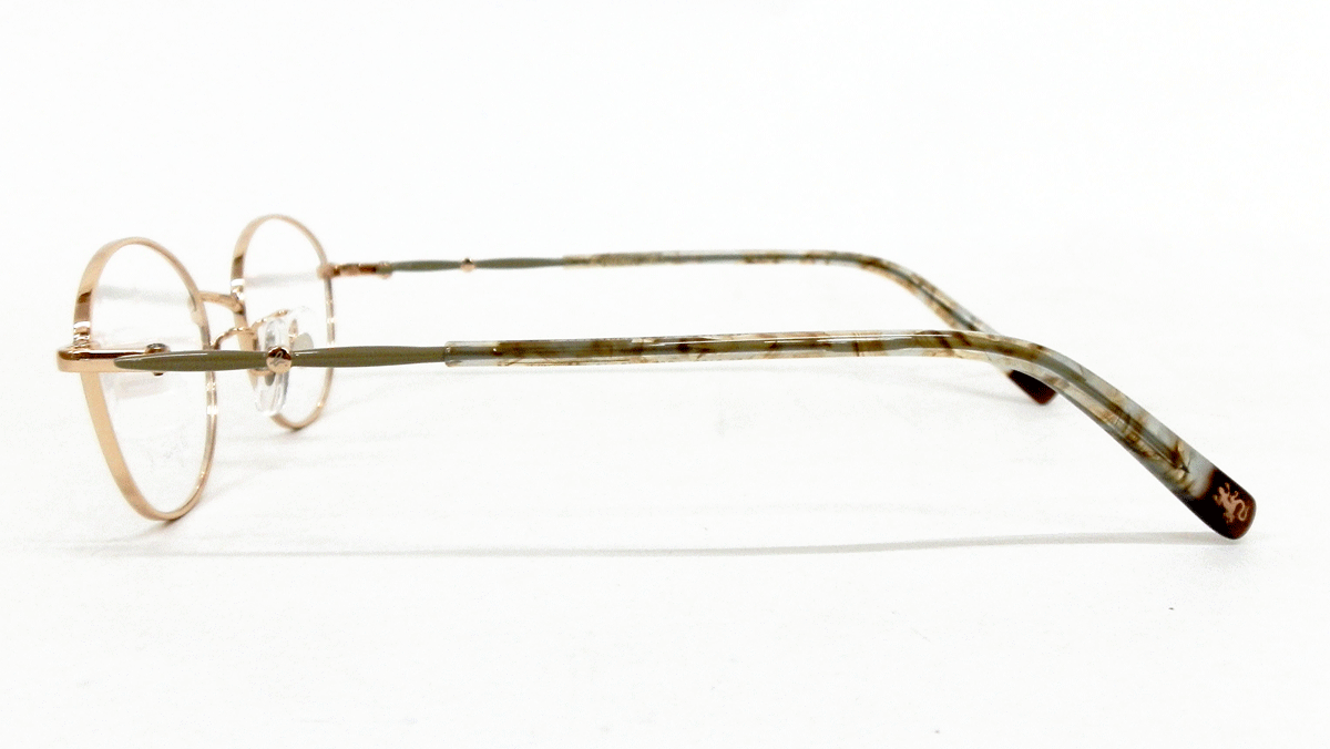 天地浅めで掛けやすいシェイプがベース。ヨロイ側が少し長めでキャッツアイ風なのでオーソドックスなシェイプでも、垢抜けた印象に仕上がっています。Agnes b.のアイコンであるリザードモチーフを、モダンエンドに。さりげなく光るメタルアイコンが印象的。先端にはモダンと異なるアセテートを張り合わせてアクセントに。